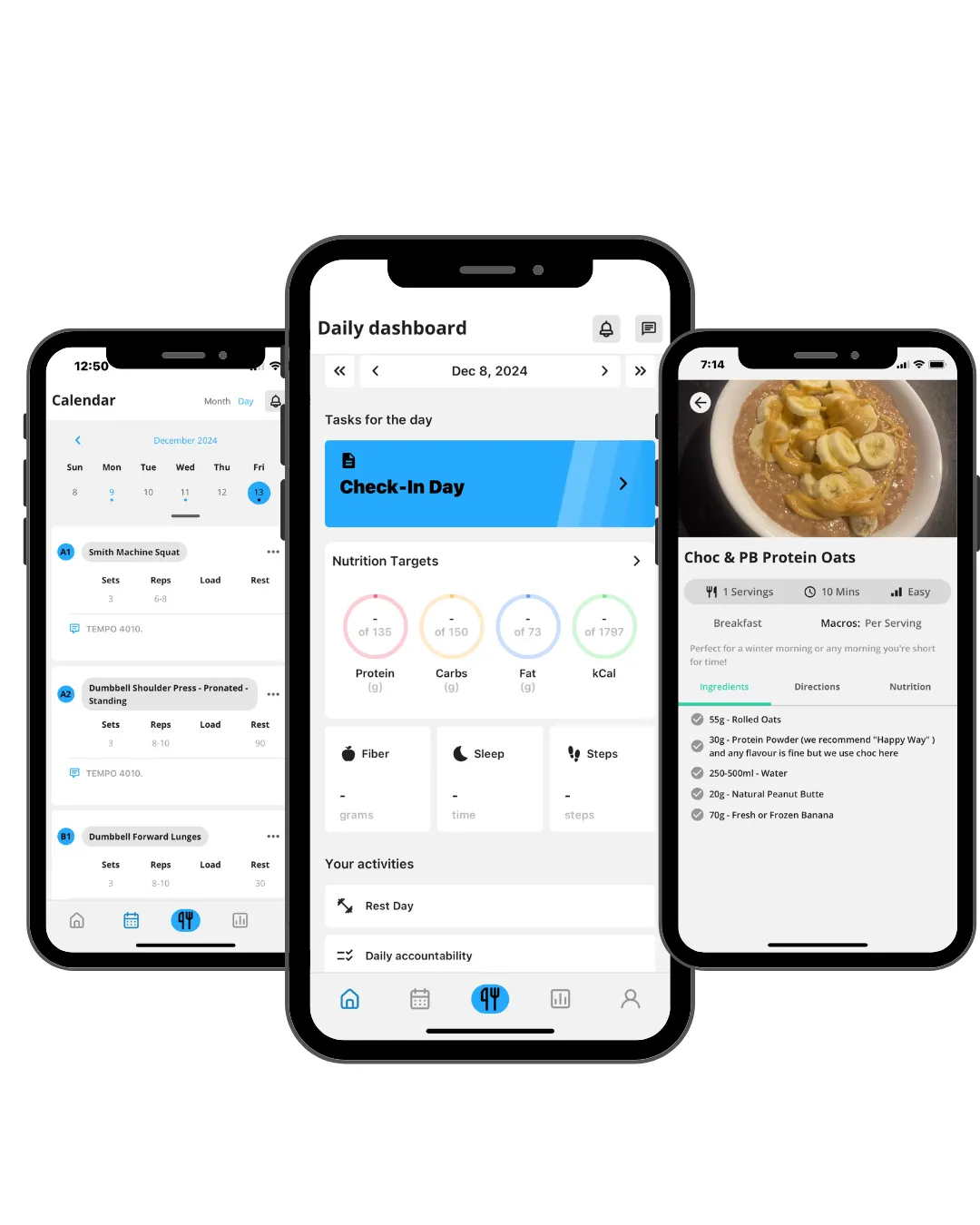 Access all training programs, our full recipe library, education hub, macro calculator, and progress tracking tools — all in one place.